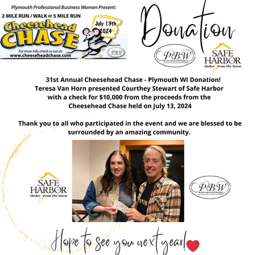 Teresa Van Horn presented a check to Courtney Steward of Safe Harbor in the amount of $10,000 from the 31st Annual Cheesehead Chase - Plymouth WI proceeds.